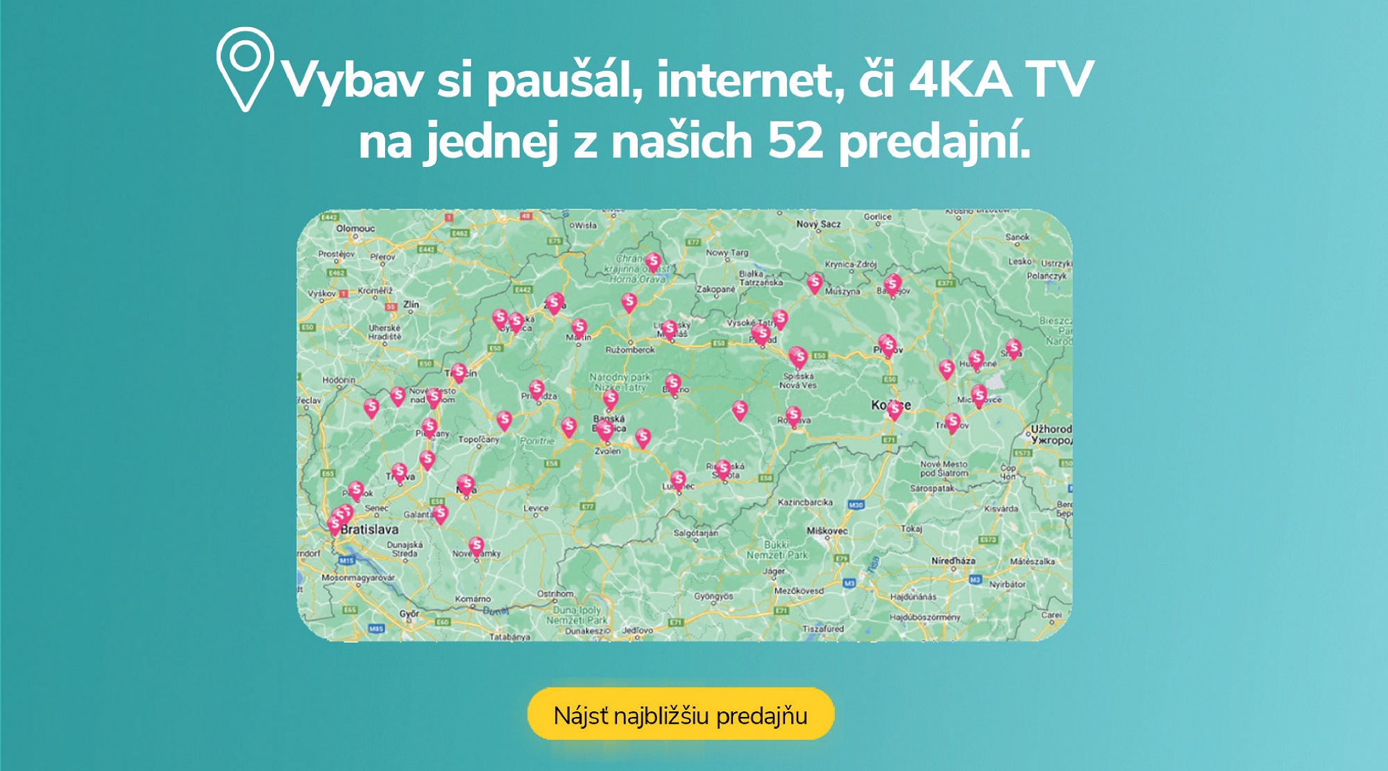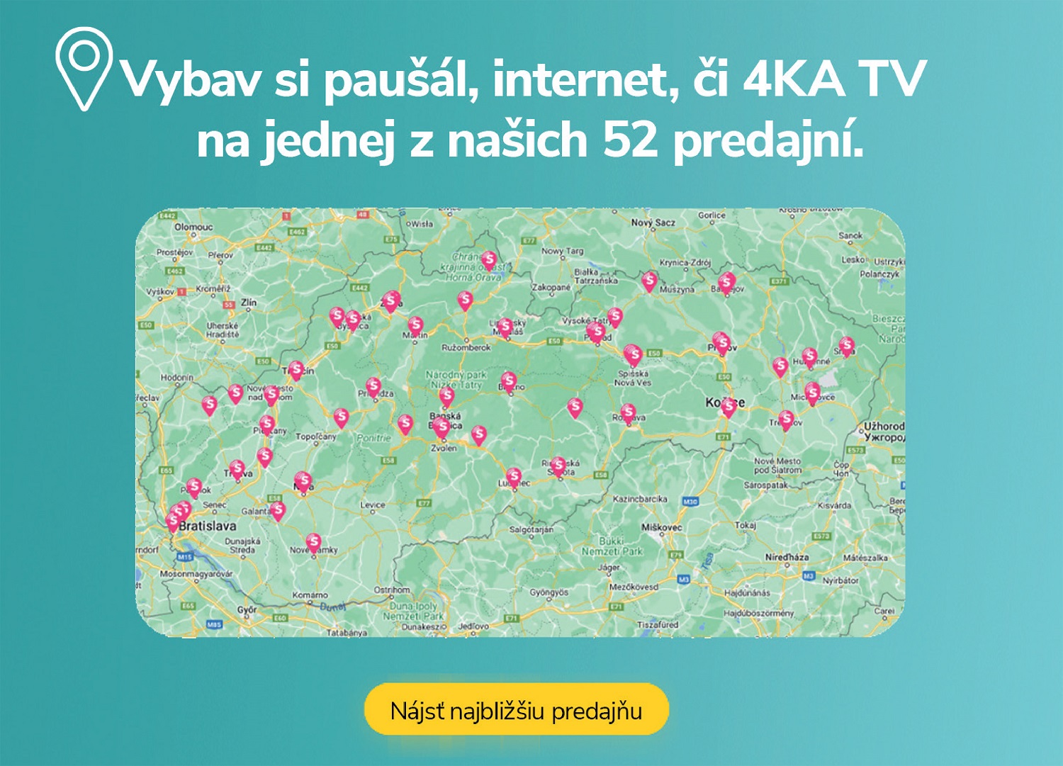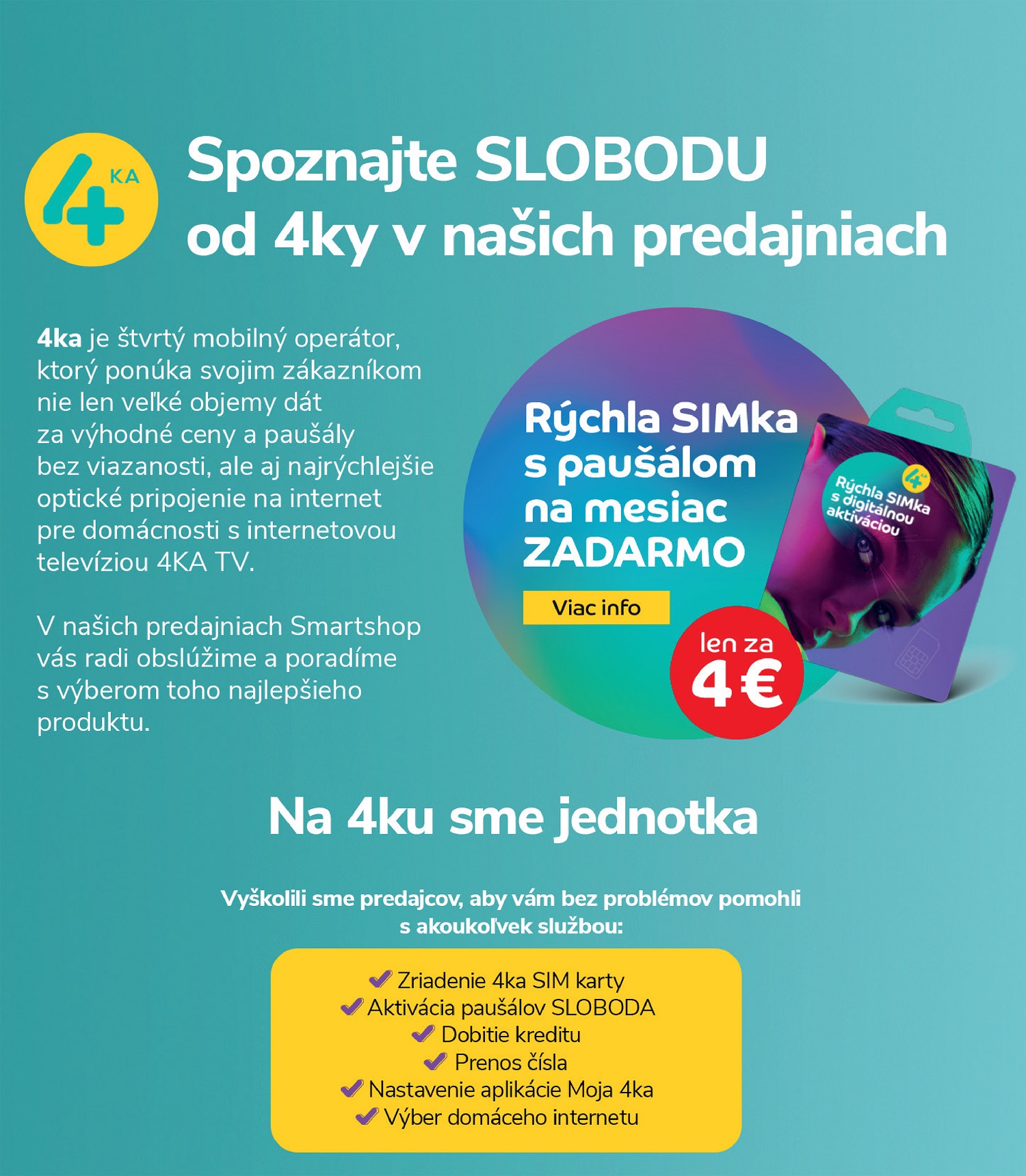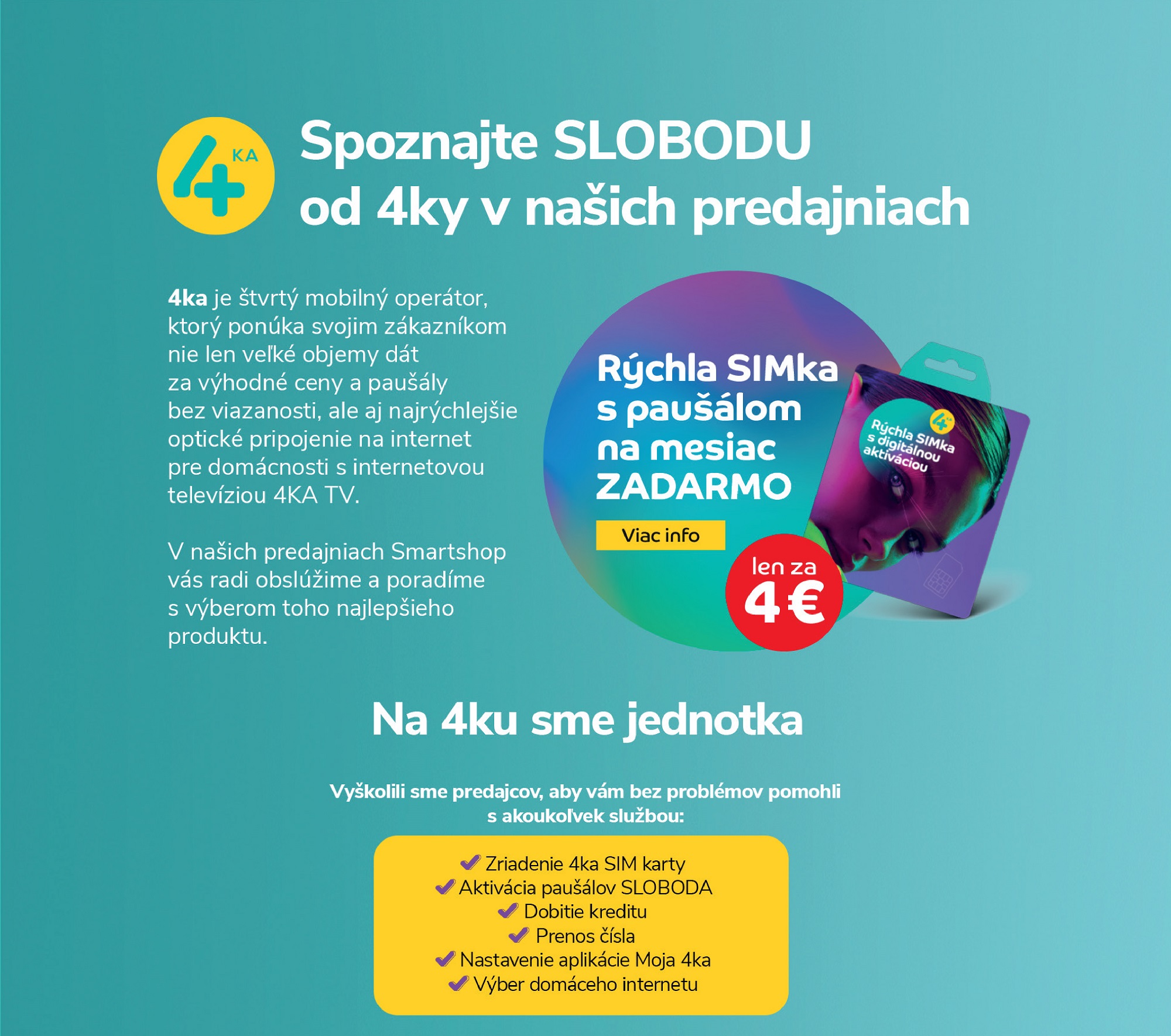 4ka je štvrtý mobilný operátor, ktorý ponúka svojim zákazníkom nie len veľké objemy dát za výhodné ceny a paušály bez viazanosti, ale aj najrýchlejšie optické pripojenie na internet pre domácnosti s internetovou televíziou 4KA TV. V našich predajniach Smartshop vás radi obslúžime a poradíme s výberom toho najlepšieho produktu.