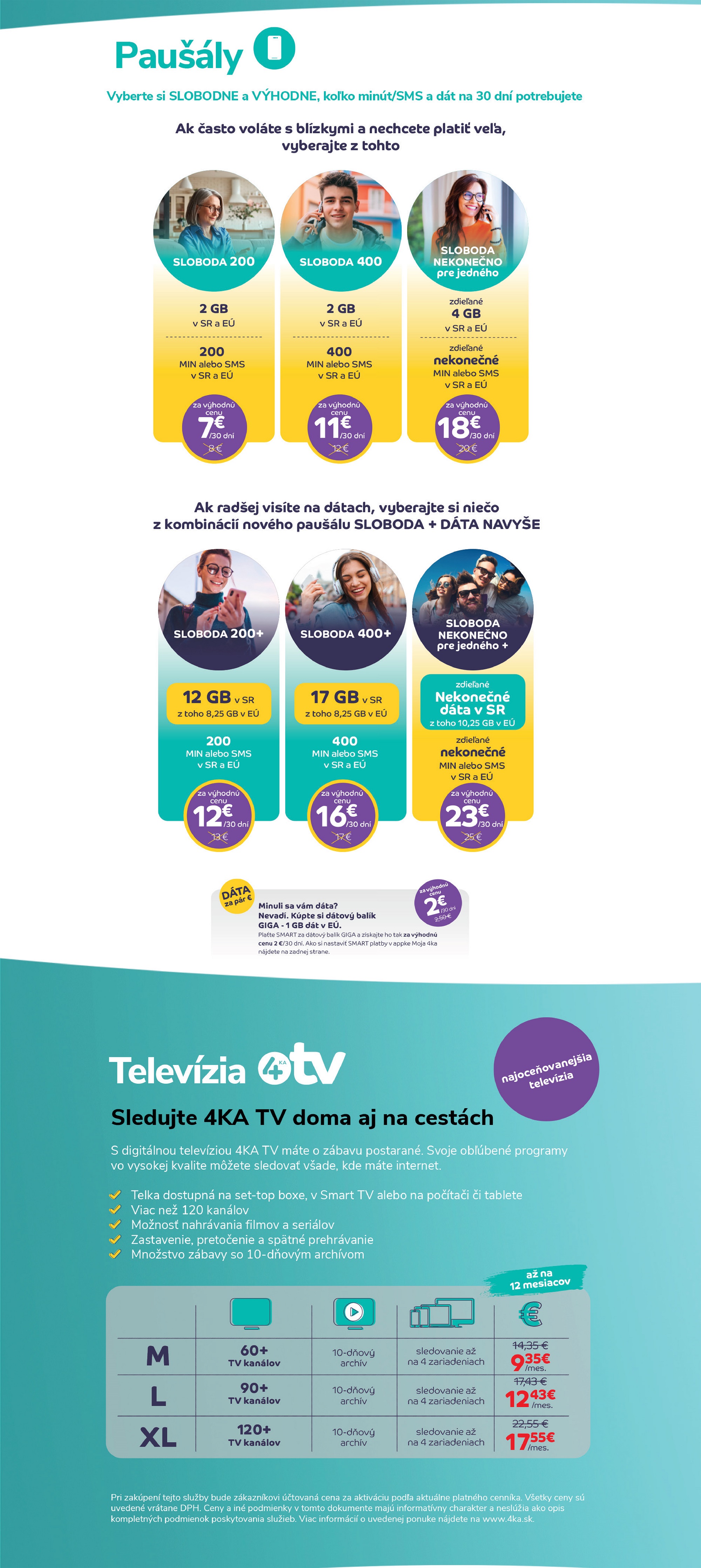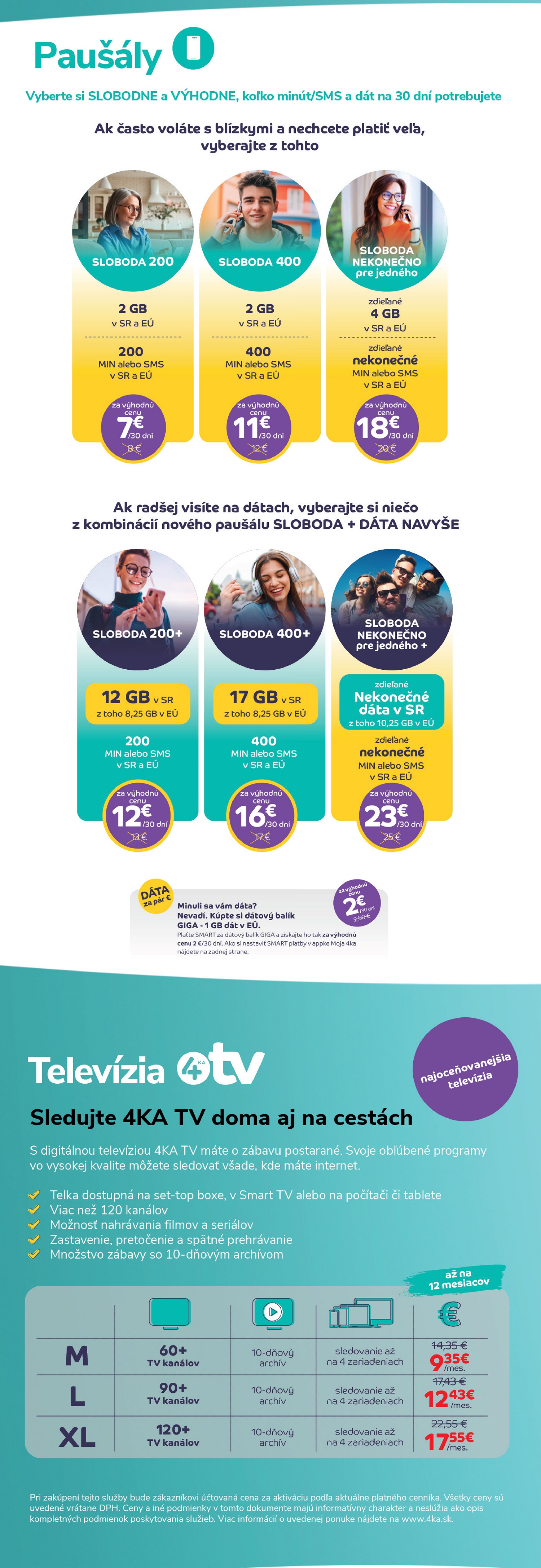 Pri zakúpení tejto služby bude zákazníkovi účtovaná cena za aktiváciu podľa aktuálne platného cenníka. Všetky ceny sú uvedené vrátane DPH. Ceny a iné podmienky v tomto dokumente majú informatívny charakter a neslúžia ako opis kompletných podmienok poskytovania služieb. Viac informácií o uvedenej ponuke nájdete na www.4ka.sk.