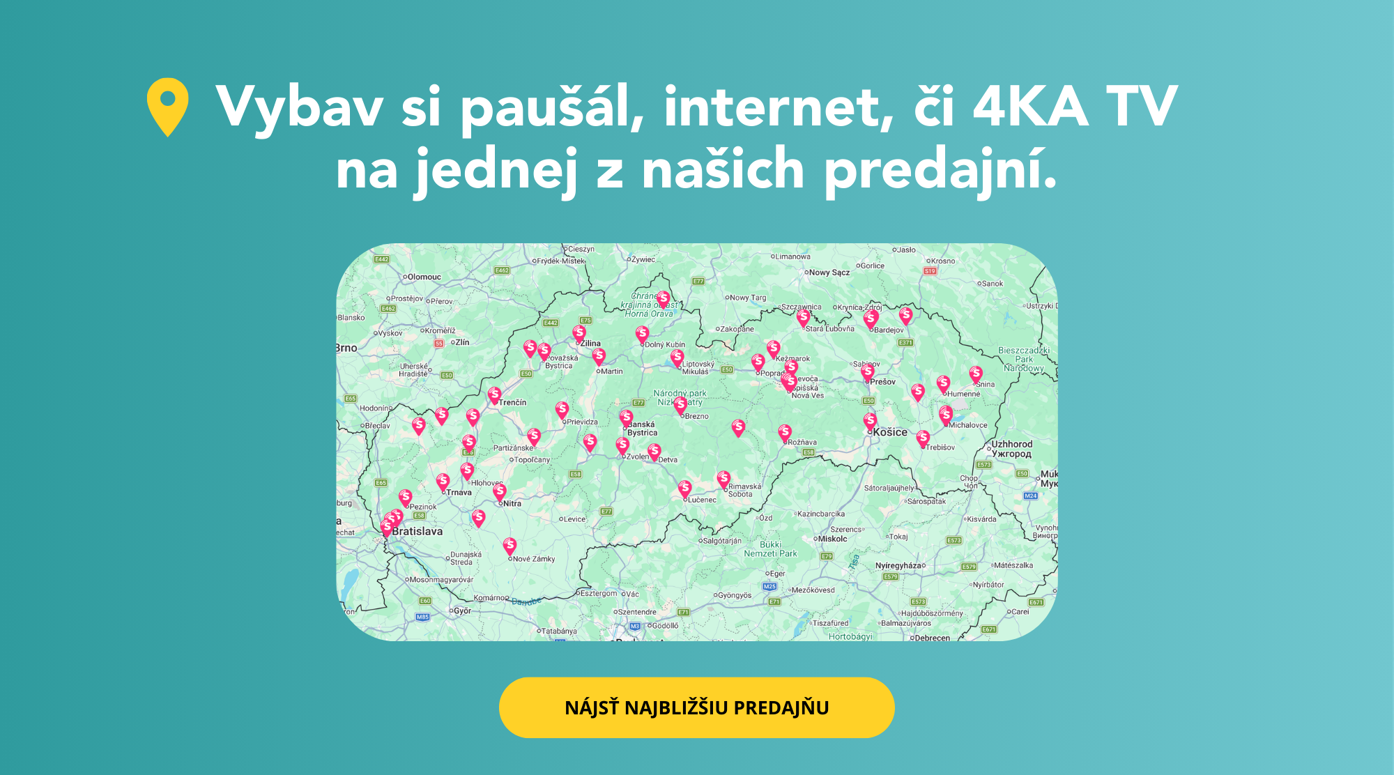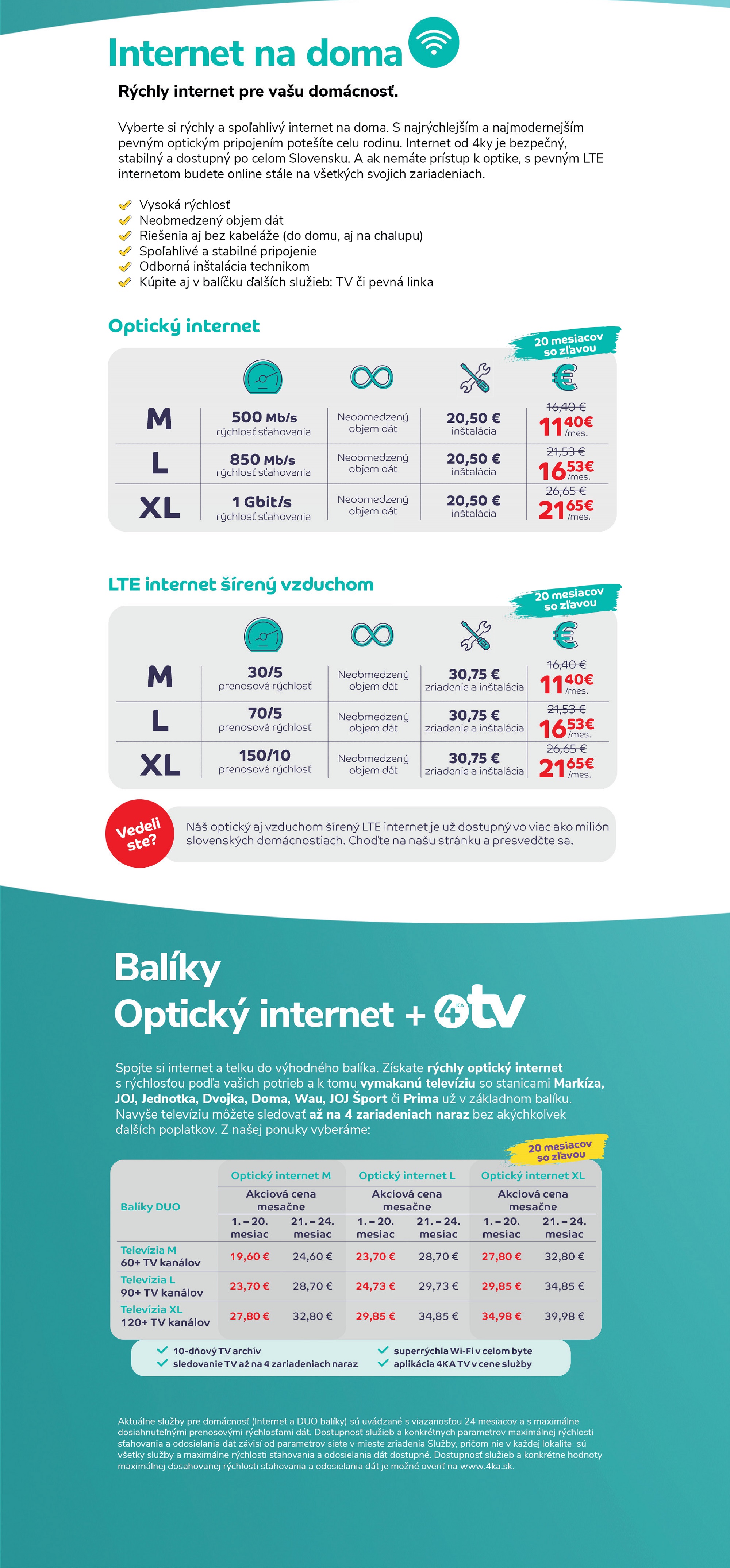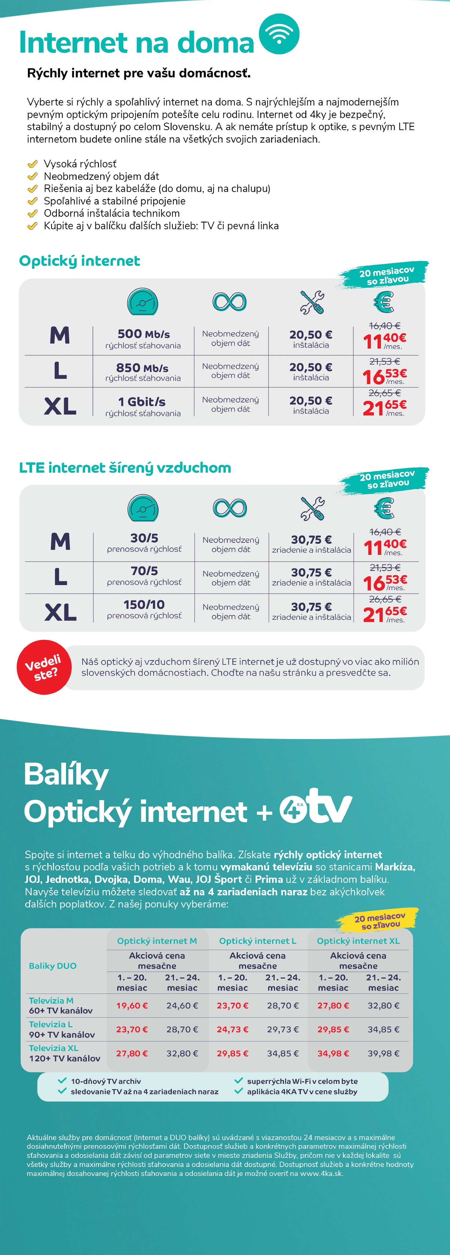 Aktuálne služby pre domácnosť (Internet a DUO balíky) sú uvádzané s viazanosťou 24 mesiacov a s maximálne dosiahnuteľnými prenosovými rýchlosťami dát. Dostupnosť služieb a konkrétnych parametrov maximálnej rýchlosti sťahovania a odosielania dát závisí od parametrov siete v mieste zriadenia Služby, pričom nie v každej lokalite sú všetky služby a maximálne rýchlosti sťahovania a odosielania dát dostupné. Dostupnosť služieb a konkrétne hodnoty maximálnej dosahovanej rýchlosti sťahovania a odosielania dát je možné overiť na www.4ka.sk.