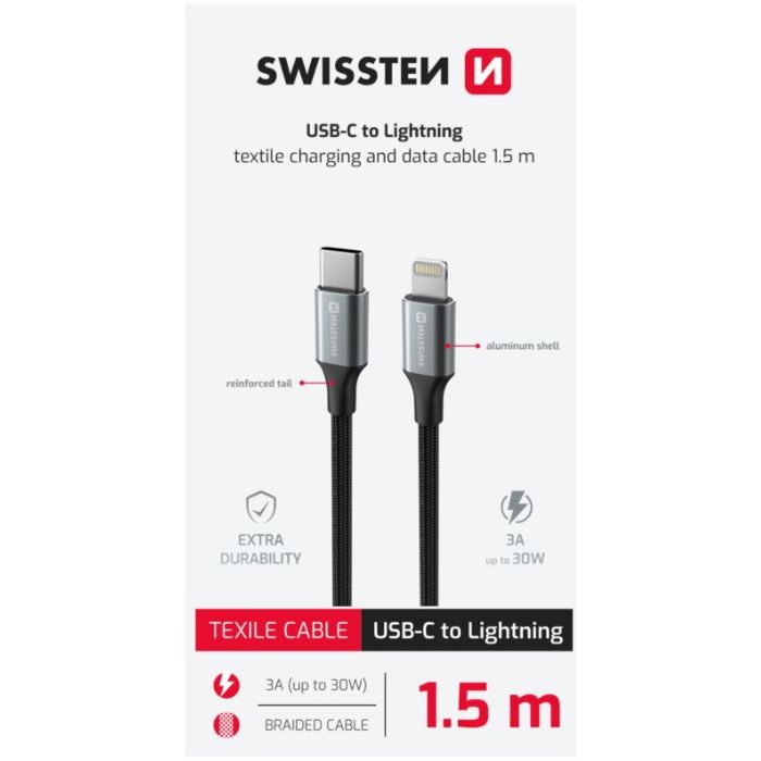 SWISSTEN TEXTILE II USB-C/Lightning 30W 3A 1,5m čierny