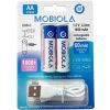 Nabíjateľné batérie Mobiola. Batérie majú USB-C port pre nabíjanie cez USB-A/USB-C kábel (v balení). Batérie majú aj LED diódu, ktorá bliká na zeleno pri nabíjaní a svieti na zelené pri plnom nabití. Batérie vydržia až 1000 nabíjacích cyklov. Nabijete ich za 40 minút.